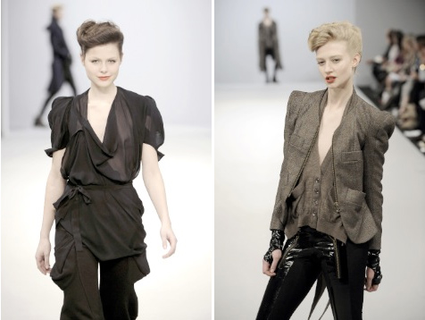 Saw this over at kingdom of style and INSTANTLY fell in love with the look on the right. I actually don't totally dig the whole collection, and I think a few of the silouettes would look pretty funky on those of us not gifted with a twiggy stature...but I really love what they are doing here. Mixing the buttoned up, straight look with the gothrock look I was ever so fond of at 13. God I wish sometimes that I had kept my pvc black bondage pants. Yes I do. I never thought I would be saying that. Shit.